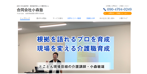 代表の小森敏雄氏が自ら講師として教壇に立ち、カリキュラムも作成しているこだわりの塾です。介護の現場で役立つ受講生の目線に立った講義には定評があり、机上の空論ではない本当に役に立つ学びを体験できると受講生から評判。受講者のほとんどが口コミや紹介による入塾者です。